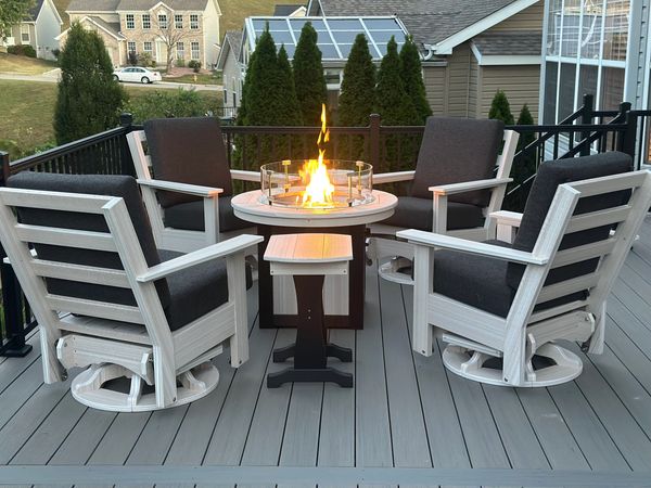 Includes Four deep seat swivel gliders with Sunbrella cushions) and 36-in fire table (with lid, glass wind guard, fire glass, and cover)